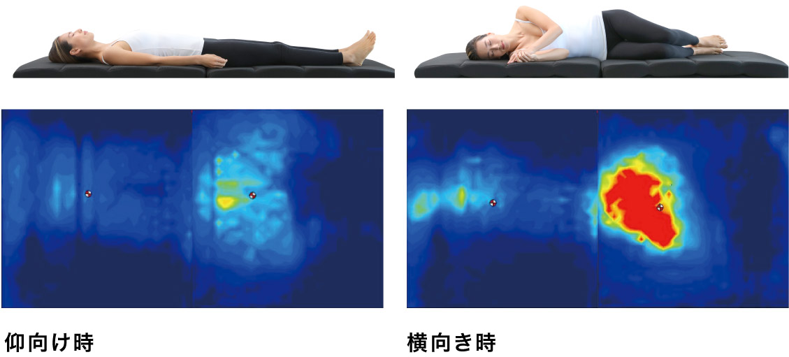 横になった時の凸部、股関節の大転子や上腕骨の骨頭、仙骨、踵等を格子の柔らかい部分で受け止めつつ周りのハード部分が支えるので、圧迫による負担を軽減します。