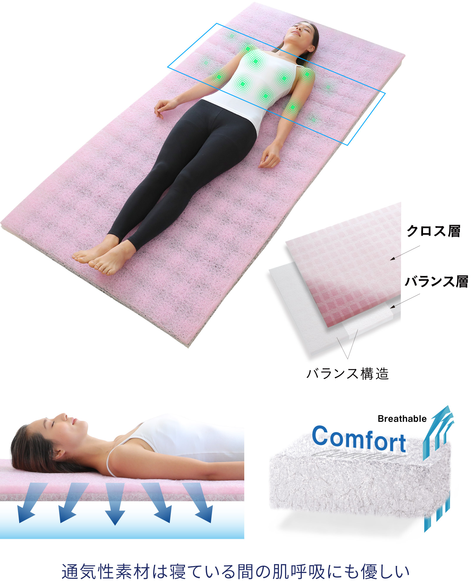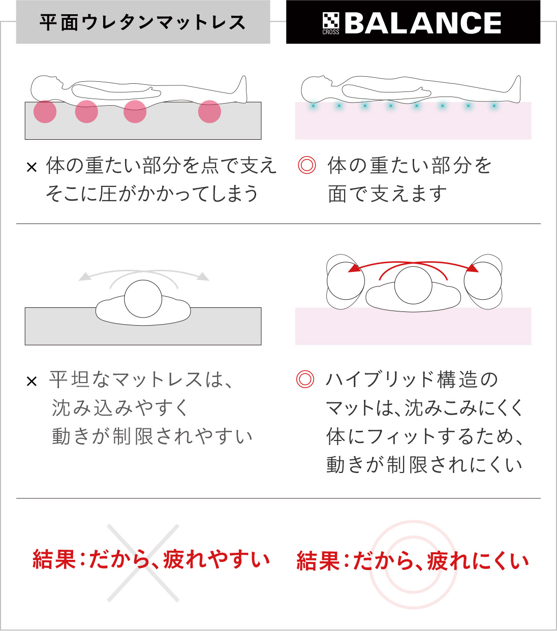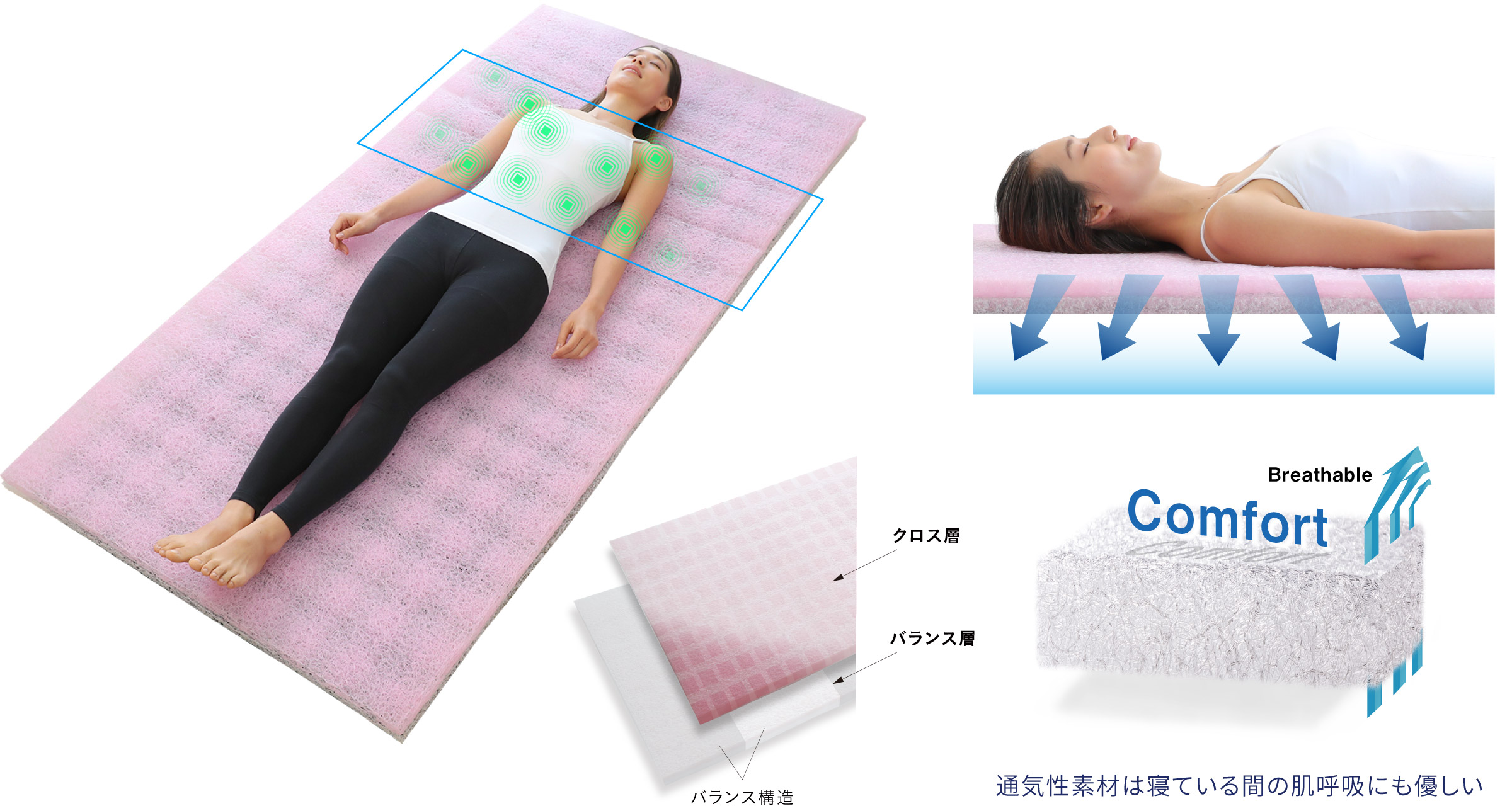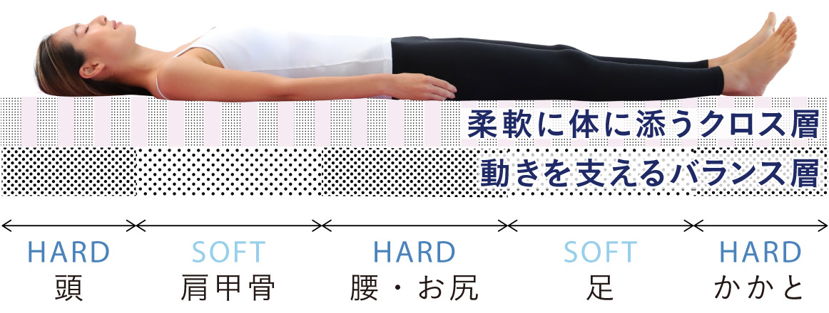 就寝中でも動きを止めることなく、理想のバランスでサポートします。格子状の構造が、人の動きに合わせて沈んでは、また復元しを繰り返し身体を送り出すように支えるので、負担をかけず常に快適な「寝姿勢」を保ちます。